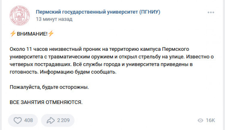 Как пишет издание 59.RU, в пресс-службе университета информацию о стрельбе подтвердили. Человек стрелял из травматического оружия. Один из пострадавших получил ранение в голову и находится в сознании.