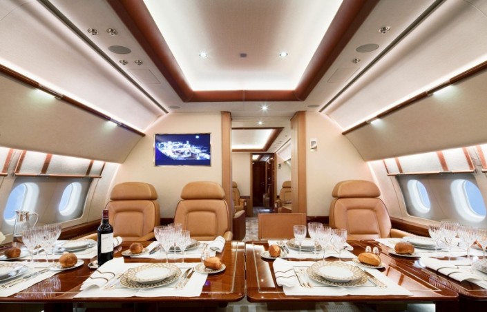 Описывая самолет, телеканал утверждает, что в воздушном судне оборудованы гостиная, спальная комната, офис, ванная комната, переговорная на 12 человек с большим жидкокристаллическим дисплеем и средствами специальной связи. Интерьер самолета отделан эксклюзивными компонентами - редкими лиственными породами, специальной отделкой кожей, мрамором, драгоценными металлами.
