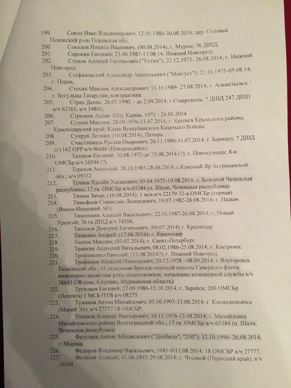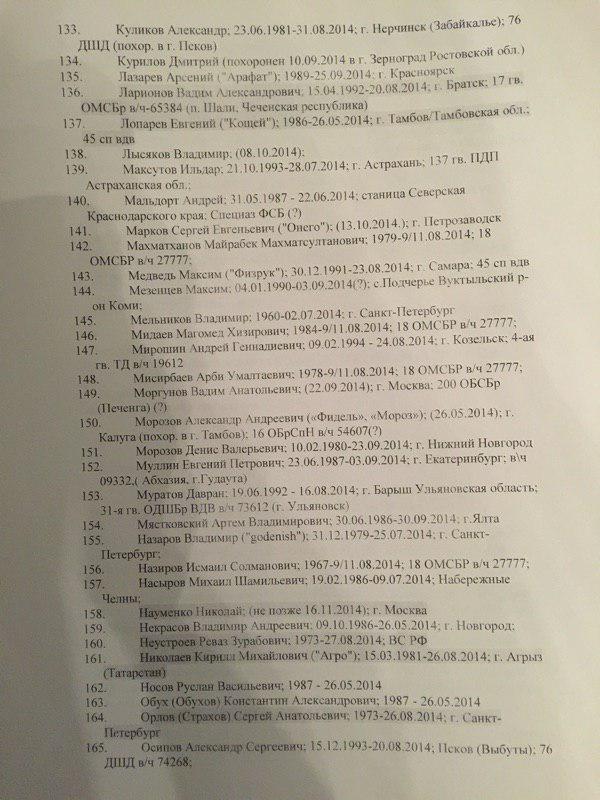 В представленном списке 227 фамилий. При этом сообщается, что "смерть многих людей из списка подтверждается открытыми источниками". Так, по словам специального корреспондента ИД "Коммерсантъ" Ильи Барабанова, который неоднократно ездил в командировки в Донбасс и занимался расследованием смертей россиян на этой войне, "в этом списке очень много знакомых фамилий, некоторые проходили по СМИ и соцсетям".
