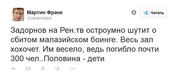 Пользователи социальных сетей активно обсуждают шутку известного российского юмориста Михаила Задорнова о сбитом над Украиной малайзийском Boeing-777, сообщает "Русская служба Би-би-си".