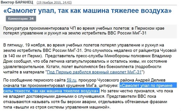 Оказалось, что Джен Псаки такие слова не произносила - это сделал прокурор Чусовского района Пермского края Андрей Делиев совсем по другому поводу. "Самолет упал по причине силы тяжести, так как машина тяжелее воздуха", - так прокомментировал Делиев падение истребителя МиГ-31 в ходе учебных полетов в ноябре 2010 года.
