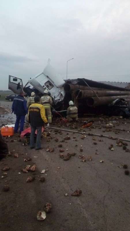 По предварительным данным, водитель легковушки, выезжая со второстепенной дороги, столкнулся с КамАЗом. После удара обе машины выехали на полосу встречного движения и столкнулись с  автомобилем марки MAN. В результате столкновения грузовых автомобилей произошло падение груза (труб) с автомобиля MAN на ВАЗ-2111.