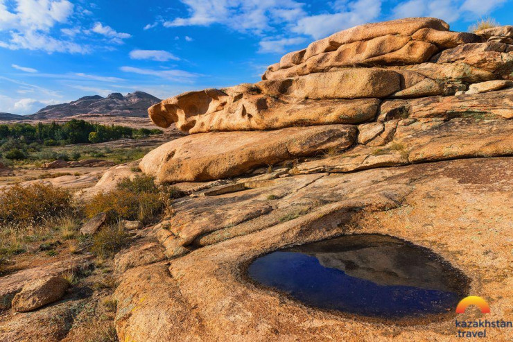 Среди гранитных образований растут небольшие лесочки, есть озерца да загадочные пещеры. Это, пожалуй, единственное из перечисленных нами выше "инопланетных" мест, где вероятность остаться без питьевой воды сведена к нулю. Название горы, как говорят в народе, в переводе означает "гора святого старца Бека", который жил в пещере на вершине Бектау-ата.