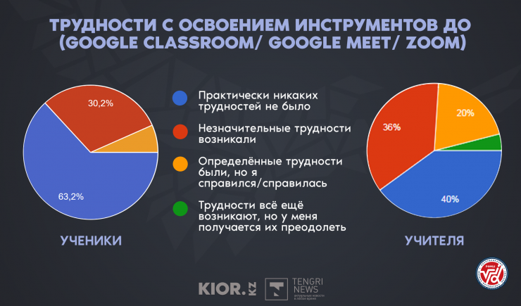 Согласно данным опроса школы, большинство опрошенных учителей, 40 процентов, ответили, что не испытывали трудностей в освоении инструментов дистанционного образования, 36 процентов учителей ответили, что возникали небольшие трудности, а 20 процентов заметили, что были определенные трудности, но они справились.