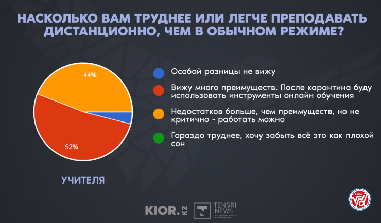 "К сожалению, у нас были некоторые учителя пенсионного возраста, хорошие. Но им это было сложно из-за зрения, и они решили уйти на пенсию. Таких было несколько учителей. Конечно, учителя жалуются, что зрение подсело: много времени за компьютером проводили. Многие думали, что онлайн-образование учителю облегчило работу. На самом деле вдвойне больше работы. Во-первых, они готовили на каждый урок отдельную презентацию. Проверка работ тоже непростая, это не школьные тетради", - заметил Алмаз Кунгожин.