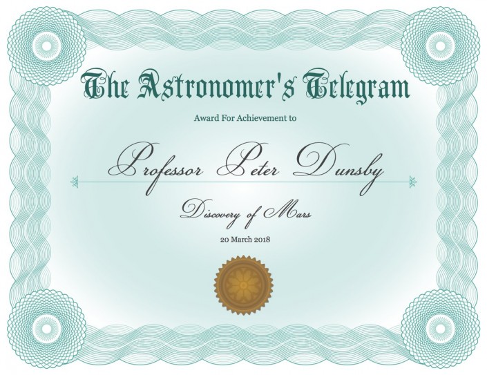 Космолог Питер Дансби из Кейптаунского университета (ЮАР) сообщил о неизвестном астрономическом явлении, которое оказалось Марсом. За это "открытие" исследователя наградили шуточным сертификатом, пишет Science Alert.
