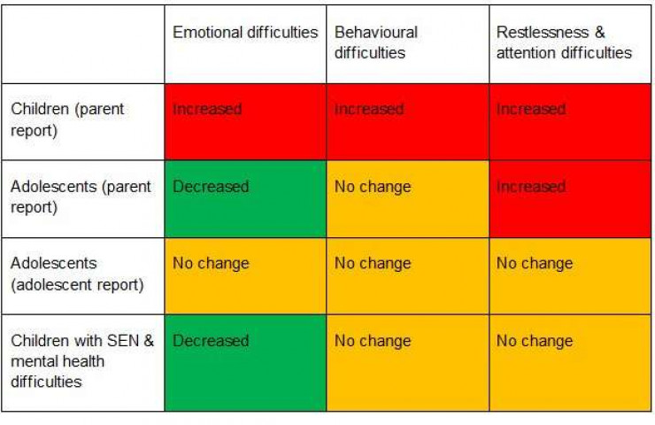 University of Oxford. Красным обозначено увеличение психологических проблем. На первой строчке дети в возрасте 4-10 лет.