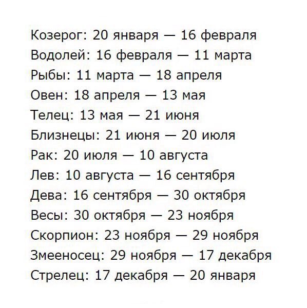 Ниже представлен обновленный гороскоп, в нем уже учтены и измененные даты, и новый знак Змееносец: