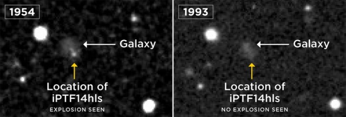 Архивные снимки обсерватории Palomar указывают на возможный взрыв iPTF14hls в 1954 году. На снимке 1993 года сверхновой уже не видно. © Nature