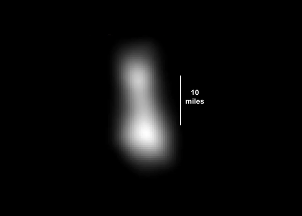 Ученые, изучившие переданные на Землю первые снимки астероида, пришли к выводу, что он похож на сильно вытянутое тело размером 32 на 16 километров, состоящее из двух частей, соединенных тонкой перемычкой. Версия, что объект все же является тесной двойной системой, пока остается рабочей.