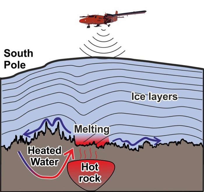 С помощью специального самолета ученые провели радиолокационные исследования, охватив участок с восточной стороны Антарктиды размером 50 на 100 километров. Локатор проник через трехкилометровый ледяной щит и отобразил поверхность земли под ним. Данные показали, что под земной корой существует источник тепла, который плавит лед снизу вверх.