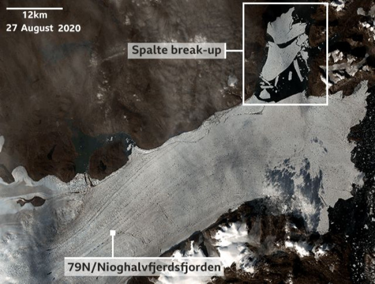 Спутниковые снимки показали, что он разлетелся на множество мелких осколков. Также известный как 79N, шельфовый ледник Ниогхалвфьердс-фьорд является одним из крупнейших в мире. Его длина составляет около 80 километров в длину и 20 километров в ширину. Он играет важную роль в регулировании арктического климата вокруг Гренландии.