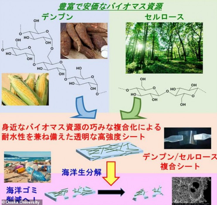 Группа ученых извлекла крахмал из маниоки и объединила его с клетчаткой, взятой из древесной массы. Смесь растворили в водном растворе и распределили по прозрачному пласту толщиной 0,01 сантиметра. Затем готовый продукт нагрели до полного затвердевания. Ученые утверждают, что полученный продукт вдвое прочнее обычного пластика из полиэтилена.