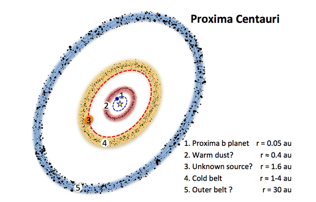 Оказалось, что близ Проксимы Центавра имеется три кольца из пыли и астероидов. Первое - наиболее теплое - расположено на удалении в 60 миллионов километров от звезды. Второй, более холодный пояс - на дистанции от 150 до 600 миллионов километров от светила. А в 4,5 миллиардов километрах от него находится третий пояс, наиболее холодный. Общую массу объектов удалось приблизительно определить пока только для одного пояса - среднего. Она оказалась равна одной сотой от массы Земли. Примерно такую же массу в Солнечной системе имеет пояс Койпера, лежащий за орбитой Нептуна.