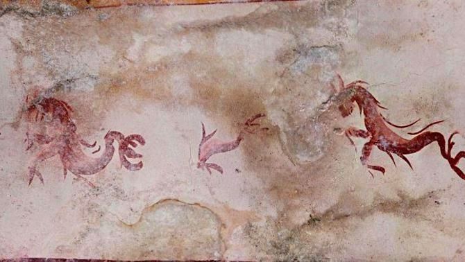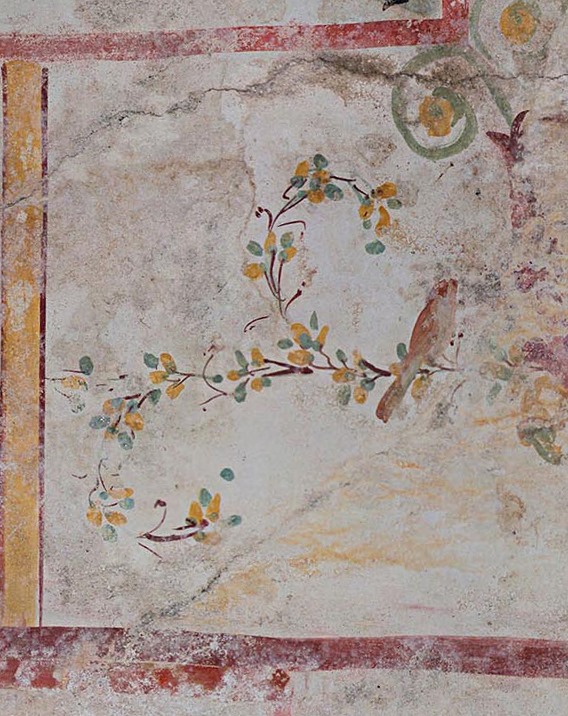 На стенах подземелья изображены воины (один из них, вооруженный луком, мечом и щитом, сражается с пантерой), птицы, танцующие кентавры, гиппокампусы, бог Пан и другие мифологические существа. Помещение получило имя "Комната Сфинкса" - по сюжету одной из фресок.