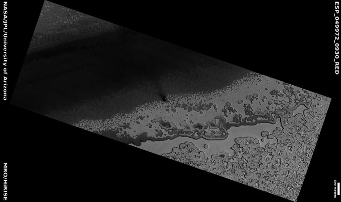 Спутник NASA HiRISE сфотографировал в районе южного полюса Марса огромную дыру, происхождение которой ученые пока затрудняются объяснить. Снимок необычного образования, сделанный 25 марта текущего года, опубликован на официальном сайте американского космического агентства.