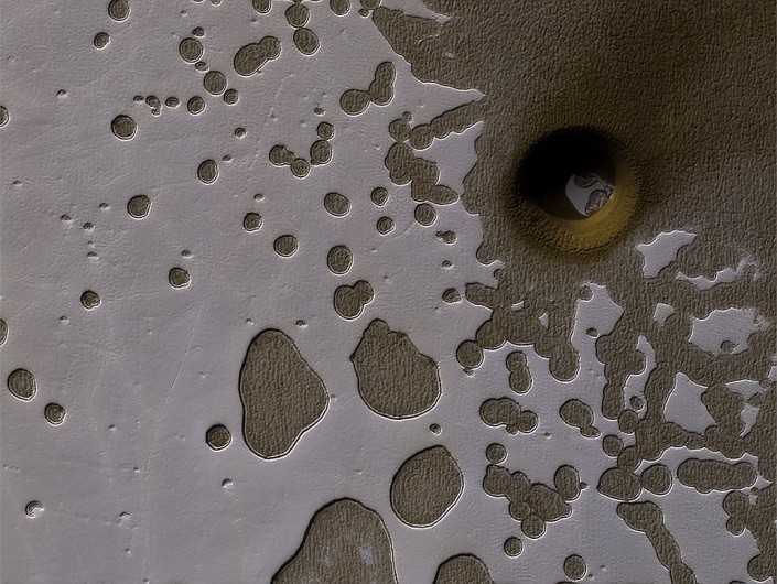 Гигантская впадина находится в районе Красной планеты, из-за множества мелких проталин получившей название "швейцарский сыр". Ее диаметр составляет несколько километров, а глубина неизвестна.
