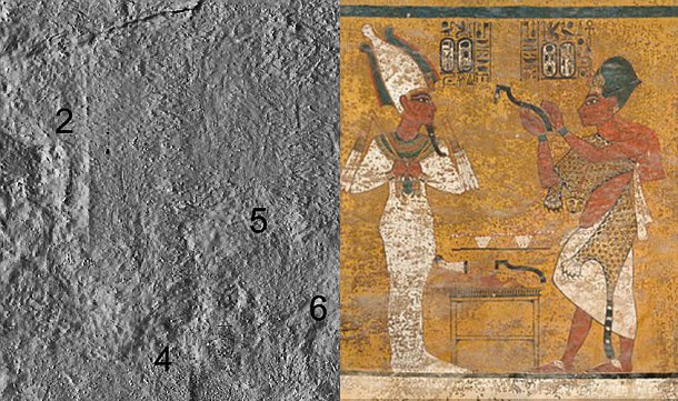 Ученый рассказал, что следы двух потайных порталов нашел, подробно изучая трехмерные снимки гробницы Тутанхамона. Дверные проемы не замечали целое столетие из-за того, что стена покрыта фреской, пояснил археолог.