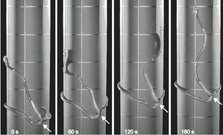 Исследователи окрестили это "движением лассо", из-за положения тела, напоминающего закинутую петлю. Змея карабкается, перемещая свое тело вокруг цилиндрических структур, крепко сжимая их петлей от туловища до хвоста.