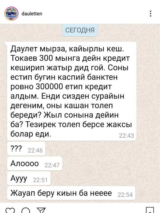 Белгілі блогер Дәулет Төлеутайұлы өзіне келген хаттардың бірін жариялапты. Онда хат авторы 300 мың теңге кредит алғанын және оны мемлекет қашан төлеп беретінін сұрайды. "Кей адамдарға дауа жоқ. Тоқаев кредит жабады екен деп, бәріміз күн сайын 300 мыңнан ала берейік. Әттең, 300 мыңға ми сатылмайды", - деп әзілдепті Төлеутайұлы.
