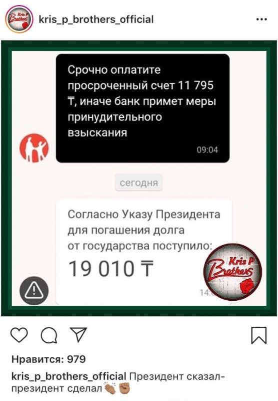 Желідегі kris_p парақшасы банк алдында берешегі бар адамның шотына мемлекеттен түскен қаражаттың скриншотын жариялап, "Президент айтты, Президент уәдесінде тұрды" деп жазыпты.