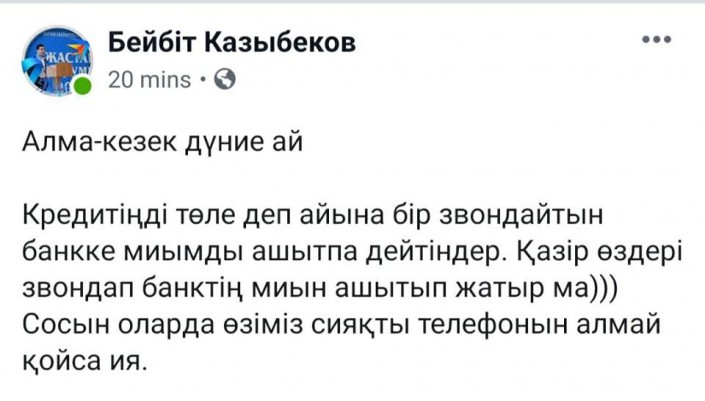 Ал Facebook желісінің қолданушысы Бейбіт Қазыбеков несие өтелетіні жайлы дүрбелеңде қазақстандықтар банк мамандарының қоңырауына жауап бермесе, енді өздері сол мамандарға қол жеткізе алмай отыр деп әзілдепті.