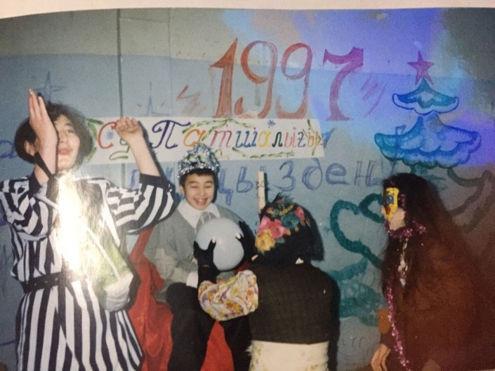 "Это был пятый класс. Я училась в школе № 44 в Усть-Каменогорске. Наша учительница любила спектакли, и на Новый год она решила поставить очередную пьесу, в которой участвовали я и моя подружка Зарина. Мне досталась роль морской ведьмы, а подруге - бабы Яги. На мне было старое платье моей мамы коричневого цвета, на лице была желтая маска, а волосы я распустила. Честно говоря, сценарий я не помню, но помню, что всем понравилось. Кто-то нас узнавал, а кто-то нет, кто-то смеялся. До сих пор смотрим фото и смеемся", - вспоминает актриса.