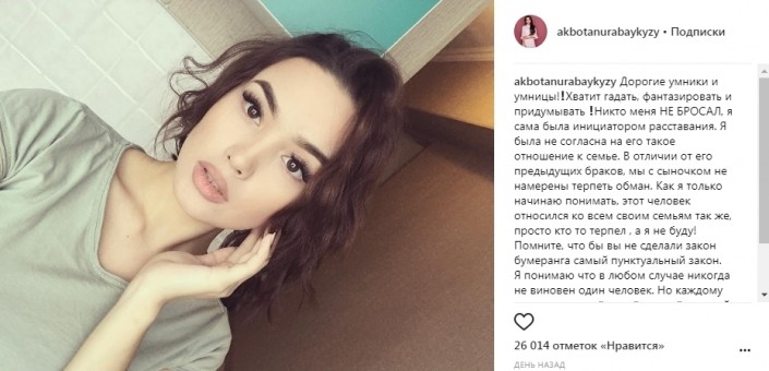 Певица и актриса, экс-солистка группы "КешYou" Акбота Сейтмагамбет обратилась к своим подписчикам в Instagram и попросила не фантазировать на тему ее недавнего расставания с мужем - известным КВНщиком Дауреном Айдаркуловым.