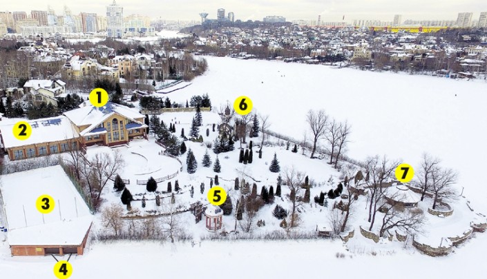 На гектаре земли Киркоров построил не только шикарный особняк (1) с бассейном, сауной и спортзалом (2), но и теннисный корт, на котором зимой заливают каток (3), гараж на две лодки или яхты (4), ротонду с выходом на собственный пляж (5) , небольшую часовенку (6) и просторную зону барбекю (7)