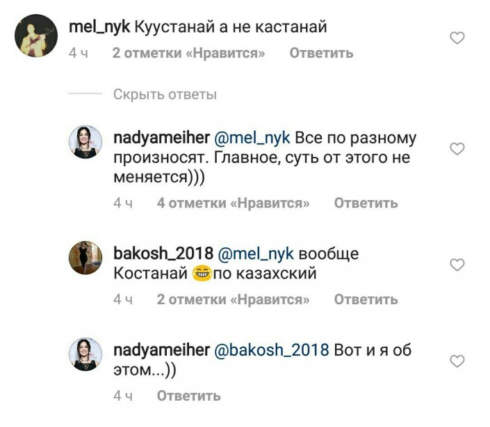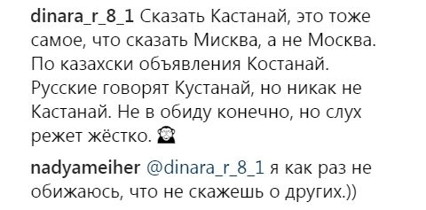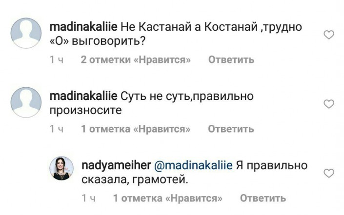 При этом, как пишут "Костанайские новости", некоторые подписчики раскритиковали артистку за произношение названия города. "Не Кастанай, а Костанай, трудно О выговорить?" - написали певице. Другие подписчики учили Грановскую говорить "Кустанай".