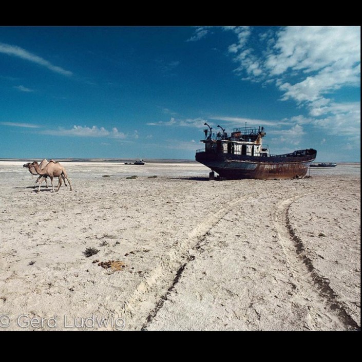 "Выражаясь метафорически, верблюды идут по воде, пересекая высохшую поверхность Аральского моря. Отвод воды в целях орошения резко сократил размеры моря, создав кладбище из обломков кораблей на месте, где некогда сверкал красивый залив. Больше фотографий, рассказывающих о последствиях загрязнения окружающей среды в бывших советских республиках, включая Чернобыльскую катастрофу, вы можете найти на моем сайте", - написал Ди Каприо, опубликовав фото с Аральского моря.