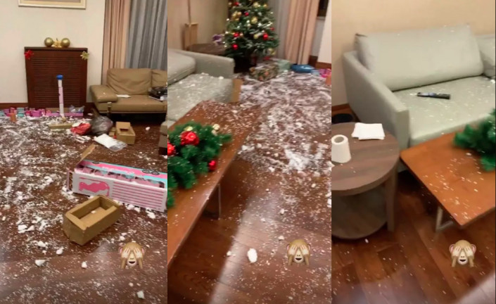 На видео показаны упавшая елка, разбросанный по всему помещению искусственный снег, поломанные вещи, коробки, а на журнальном столе оказался рулон туалетной бумаги.