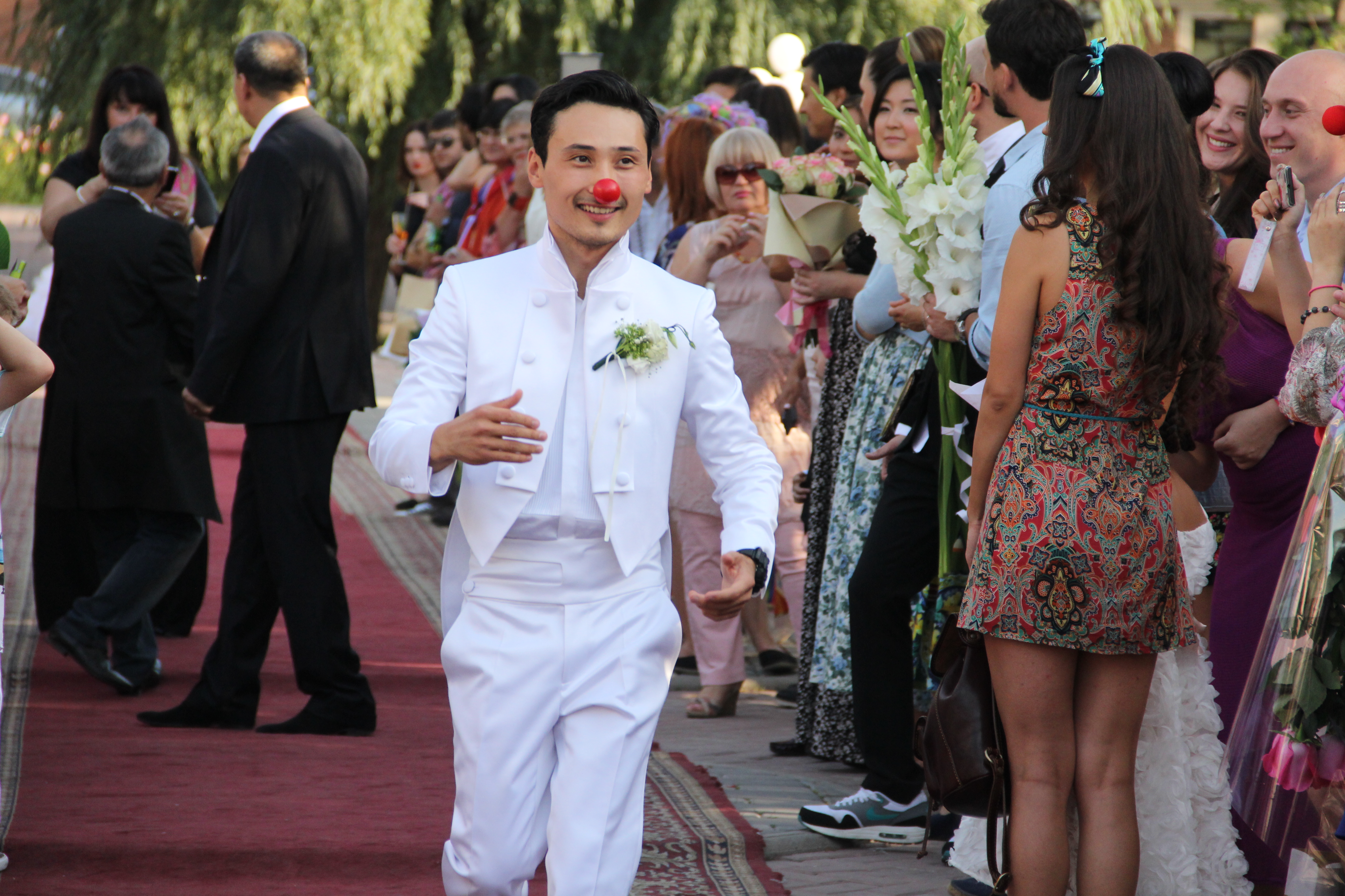 Свадьба прошла в Алматы, на открытом воздухе, в окружении родных, близких друзей и коллег. Торжественная церемония началась с красной дорожки, на которой гостей встречали клоуны, мимы, а оркестр исполнял известные композиции. Вся обстановка на свадьбе передавала цирковую атмосферу. Позже на красной дорожке появилась возлюбленная Мурата Мутурганова. Церемония началась с национальной традиции - беташар, потом молодожены дали клятву любви, а перед тем, как обменяться кольцами, жених решил сделать последнее "холостяцкое" селфи.