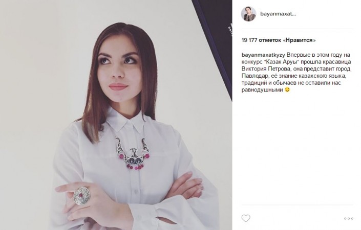 Об этом на своей странице в Instagram рассказала организатор конкурса Баян Есентаева. "Впервые в этом году на конкурс "Казак Аруы" прошла красавица Виктория Петрова, она представит город Павлодар, ее знание казахского языка, традиций и обычаев не оставили нас равнодушными", - написала она.
