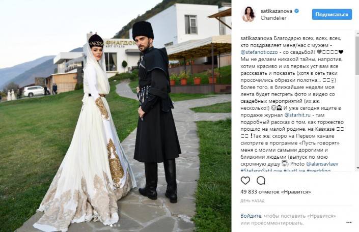 На своей странице в Instagram артистка выложила фотографии со свадебного торжества, где она и ее избранник, итальянский фотограф Стефано Тиоццо, облачены в национальные кабардинские наряды. Как пишет певица, торжество прошло на ее малой родине, на Кавказе.