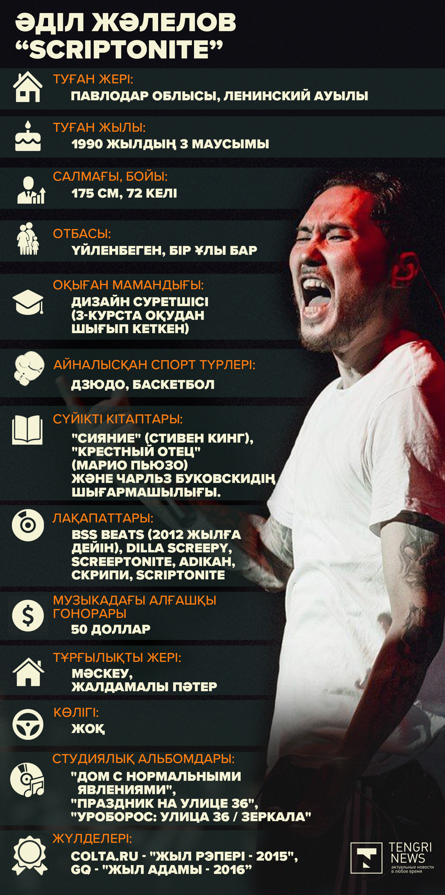 "Президент 2.0" деректі фильмінде Мемлекет басшысы Қасым-Жомарт Тоқаев қазақстандық рэп орындаушы Скриптониттің әндерін тыңдағанын, бірақ кей сөздерін түсінбегенін айтқан болатын. Скриптонит деген кім және ол туралы не білеміз? Тengrinews.kz тілшісі танымал рэпер туралы мәлімет жинады.