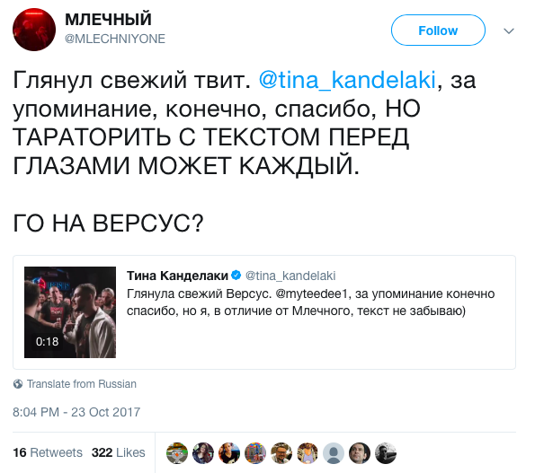 Тина Канделаки приняла вызов рэпера Млечного на Versus, сообщает The Flow
