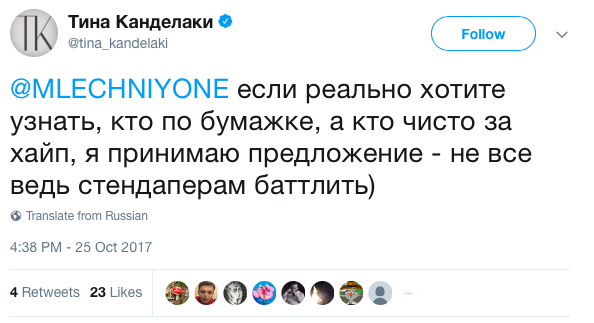 Известная телеведущая и продюсер Тина Канделаки прониклась любовью к баттлам после противостояния Oxxxymiron и Гнойного.
