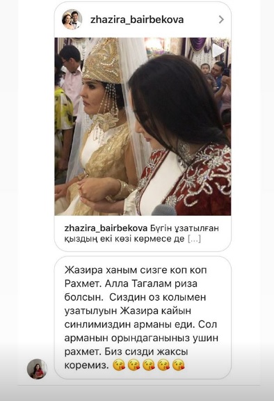 "Қыз бен жігіттің өмірге деген құштарлығына, батылдығына, ақылдылықтарына қарап риза болғаннан қатты толқып кеттім! Шын жүрегімнен аттасым Жазира мен күйеу жігітке бақыт тілеймін!", - дейді әнші.