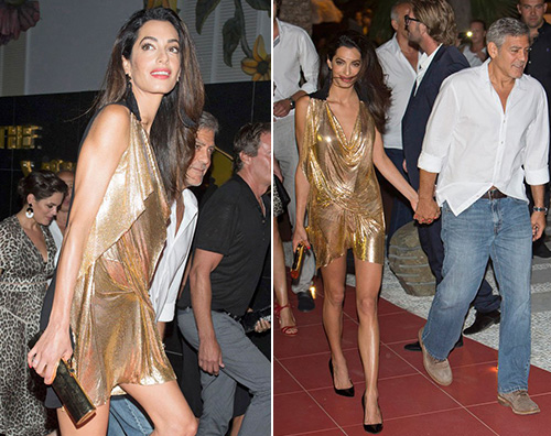 На вечеринке на испанской Ибице возлюбленная Клуни появилась в коротком золотистом наряде из струящейся ткани и тем самым привлекла внимание прессы. Столь пристальное внимание к Аламуддин объясняется тем, что известного адвоката привыкли видеть в классических костюмах и более скромных нарядах.