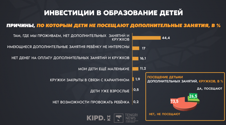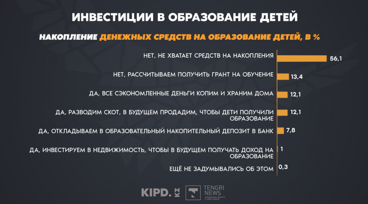 "Более чем половине опрошенных (56,1 процента) не хватает средств для накоплений на будущее образование своих детей. 13,4 процента опрошенных рассчитывают только на получение гранта на обучение. 33 процента предпринимают различные накопительные образовательные стратегии: по 12,1 процента разводят скот для продажи и копят деньги на обучение детей; 7,8 процента имеют образовательный накопительный депозит", - говорится в исследовании.