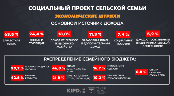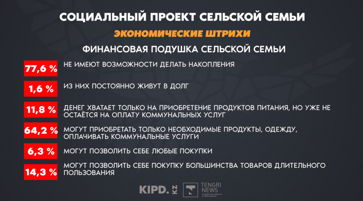 "По сельским семьям мы изучили, за счет каких доходов они живут. В тройку доходов вошли: первое – заработная плата (63,5 процента), второе – пенсия и третье место - доходы от личных подсобных хозяйств. Казалось бы, в селе специфика состоит в том, чтобы развивать личные подсобные хозяйства, а доходы от них лишь на третьем месте. Это говорит о многом", - рассказала Ракишева.