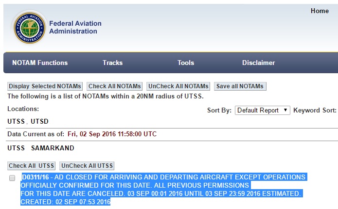 Согласно информации службы НОТАМ, аэропорт Самарканда будет закрыт с 3 сентября 00.01 часов до 3 сентября 23.59 часов для всех прилетающих и улетающих самолетов, кроме бортов со спецразрешениями.