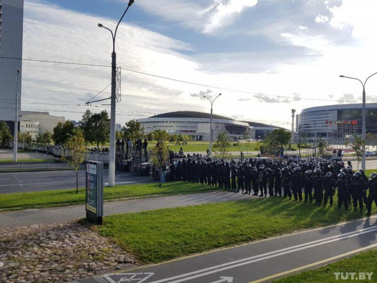 Тем не менее протестующие продолжают собираться. В сторону резиденции Лукашенко двинулись десятки тысяч человек. На этот раз манифестанты изменили прежний маршрут по проспекту Победителей, где их неизменно во время предыдущих акций встречали усиленные наряды ОМОНа, и решили обойти территорию Дворца Независимости, подойдя к нему разными колоннами с другой стороны - со стороны площади Государственного флага.