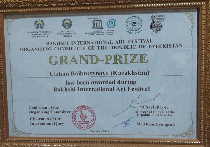 Улжан Байбосынова - победитель многочисленных международных фестивалей, директор музея народных музыкальных инструментов имени Ыкласа в Алматы, старший преподаватель Казахской национальной консерватории имени Курмангазы, обладатель ордена Кавалера литературы и искусства Франции, заслуженный деятель искусства Казахстана, член политического совета партии Nur Otan.