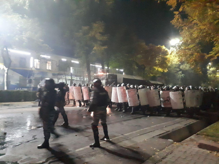 Милиция выстроилась возле кыргызского драмтеатра и отправилась колонной к Белому дому. Раздавались звуки выстрелов и взрывов. По информации издания, митингующих удалось отогнать. Они разбежались по улицам.