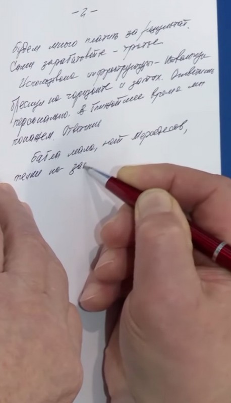 Текст виден довольно разборчиво. Насколько возможно понять, в блокноте написано: "Будем много платить за результат. Сами зарабатываете - тратьте. Использование инфраструктуры - Ковальчук блеснул на горизонте и затих. Отвечаешь персонально. В ближайшее время мы поможем ответить. Бабла мало, нет мерседесов, телки на задне...".