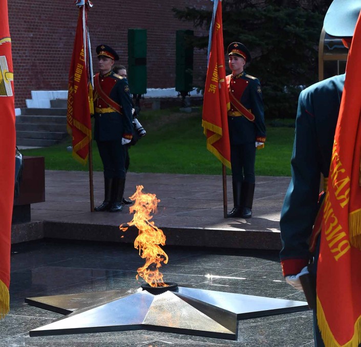 Действие проходило в Александровском саду. После минуты молчания прозвучали гимны двух стран. Путин и Назарбаев возложили цветы к обелискам городов-героев.