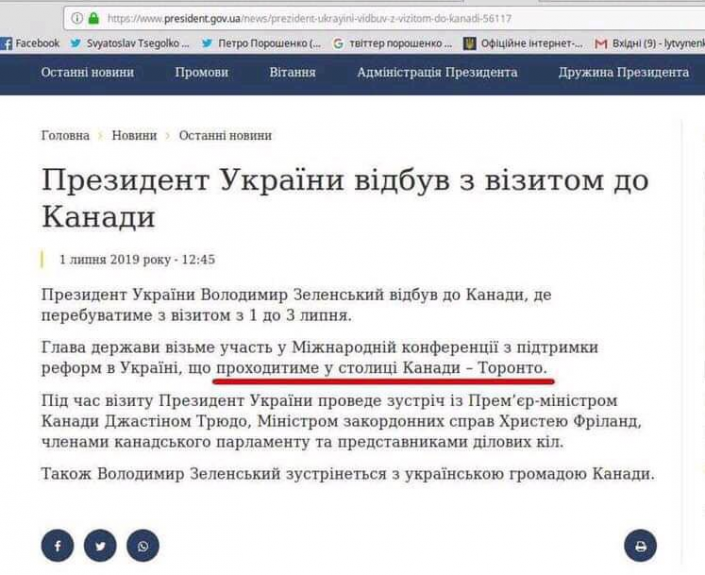 Пресс-служба Зеленского назвала Торонто столицей Канады