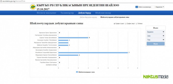 Судя по графику, больше всего голосов (семь) набрал Сооронбай Жээнбеков, далее идут Темир Сариев (три), Адахан Мадумаров (два), Омурбек Бабанов (один) и другие.